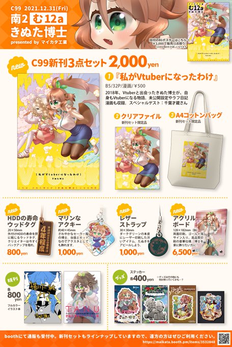 冬コミのお品書きです🐾🌱 マイカタ工業 2日目【南1む12a】 きぬた博士がVtuberになったきっかけの漫画が新刊です!新刊セットにはクリアファイルとA4コットンバッグがつきます! 先行予約もできますのでよろしくお願いします! maikata.booth.pm/items/3532848 #Vtuber #c99 お品書き