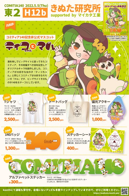 #COMITIA140 #コミティア140 東2 H12b 【きぬた研究所】 コミティア140のお土産を作りました。非公式マスコットキャラ「ティコちゃんとマル」をあしらったグッズを展開します。よろしくお願いします。 通販もあります。 maikata.booth.pm #お品書き