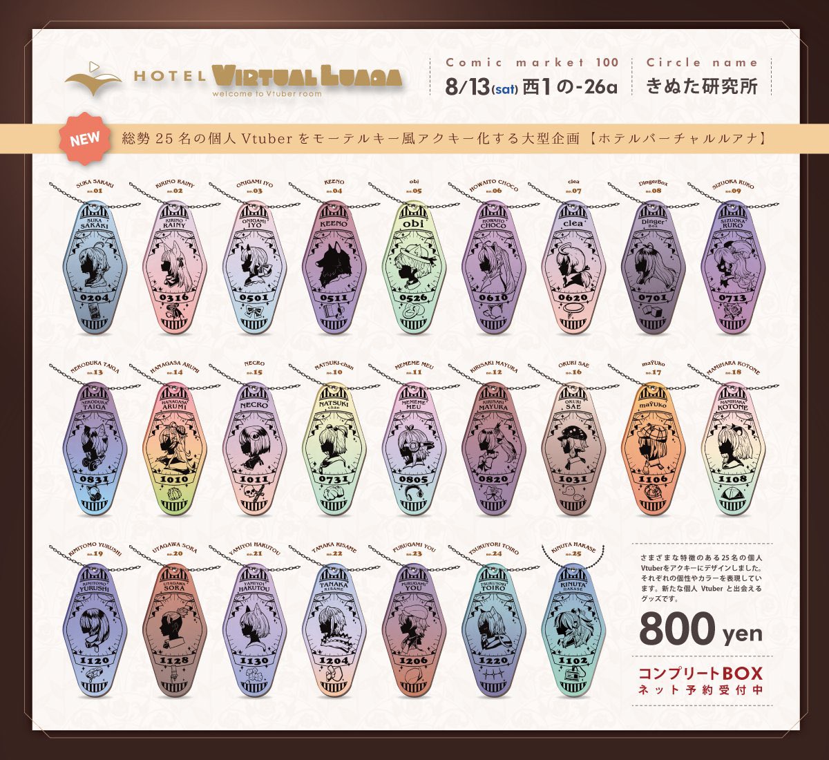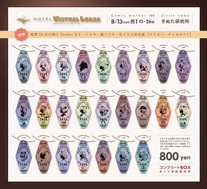 コミケ撤収しました!来てくださった方々、大変ありがとうございました!! 新作群は8/20まで注文を受け付けておりますので、ぜひみてね! 単品 booth.pm/ja/items/40279… コンプBOX booth.pm/ja/items/40479… 新作浴衣グッズ booth.pm/ja/items/40171… #C100 #C100お品書き #ホテルバーチャルルアナ