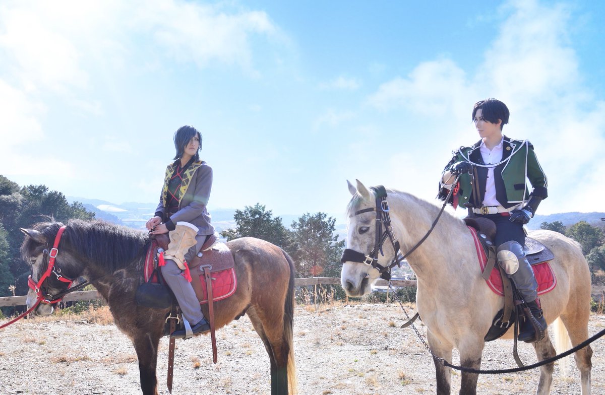 刀剣乱舞コスプレで乗馬🐎 光世=カイリうなぎ 豊前=マイケル 撮影=8100さん 撮影地=伊勢忍者キングダム