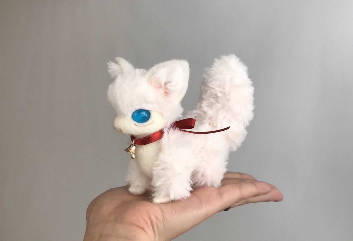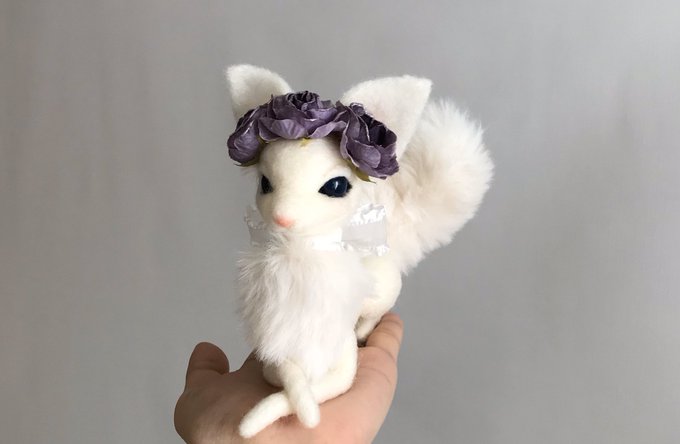 白狐[試作] スラリとした伏せ姿のスタイルの狐さんです。 首元と尻尾のファーがふさふさします(っ´ω`c) ツンと長いお鼻の白狐さんです♡ #羊毛フェルト #ハンドメイド好きさんと繋がりたい