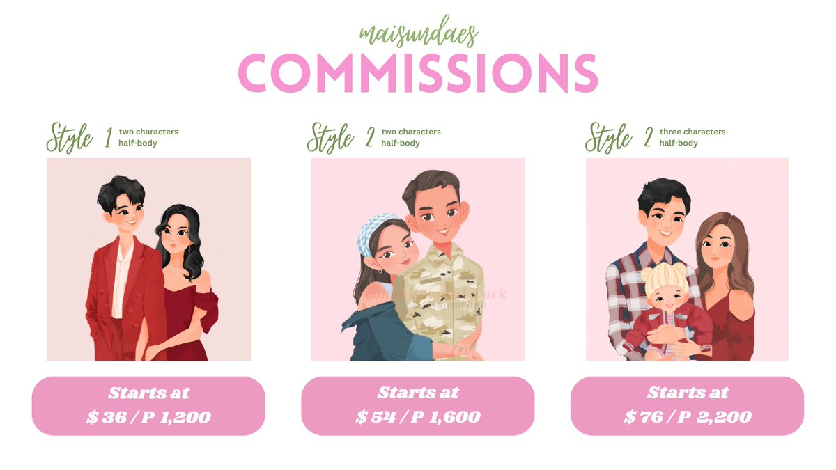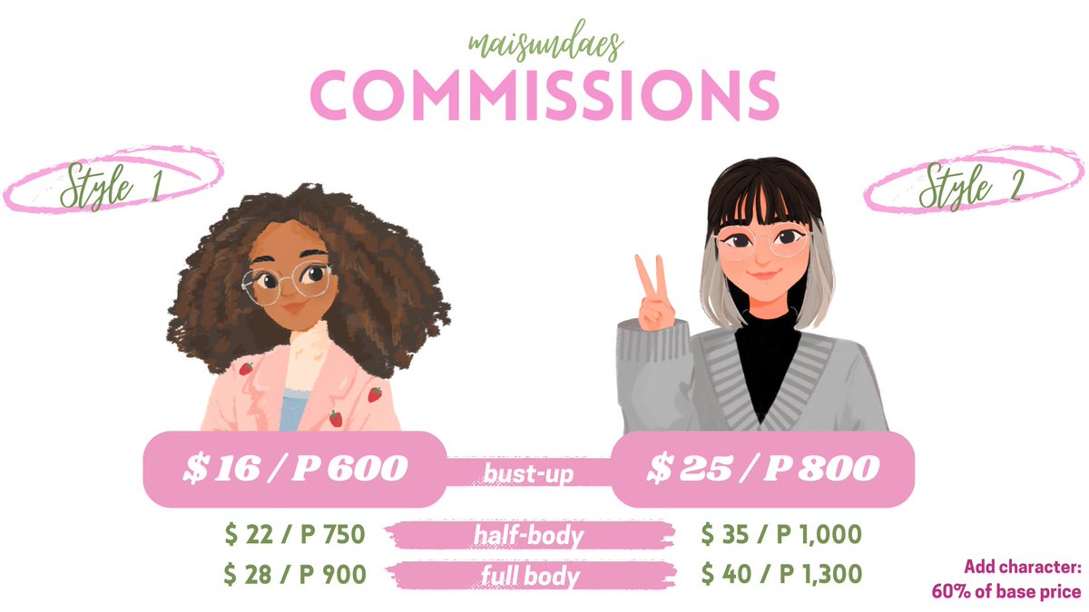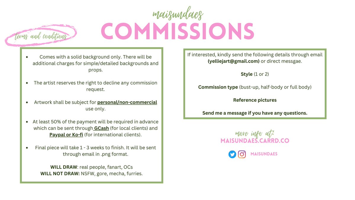 COMMS OPEN • RTs appreciated hello! my laptop broke and i need extra funds to get it fixed 🥹 if you're interested on commissioning me, you can send me a message 💗 thank you so much! 💌 yelliejart@gmail.com 🌱maisundaes.carrd.co #commissionsopen