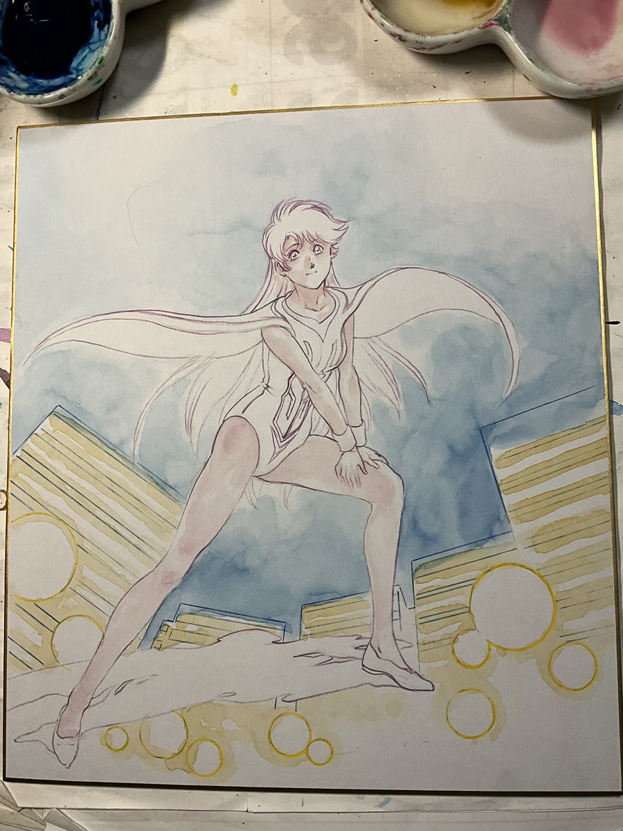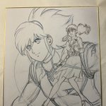 #岡崎つぐお彩色イラスト色紙 三枚目、彩色完了。 (因みにこのリクエストキャラクターは…プロデビュー後第一作の読み切り作品「恋のWスティール」ヒロインの辻岡 陽子です。作中には無いシチュエーションの特注品になります) 本日はここまで…!