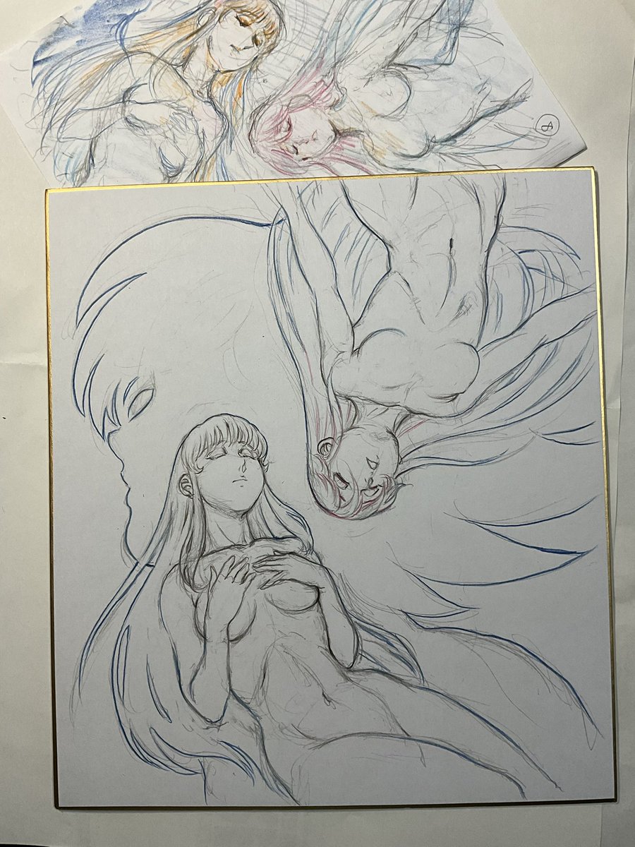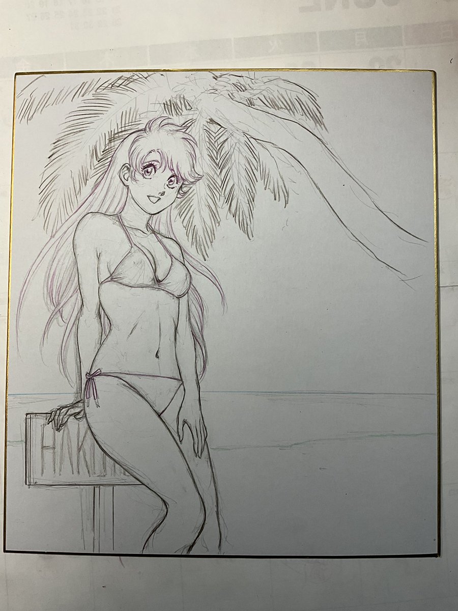 #岡崎つぐお彩色イラスト色紙 6月受注分のラスト3枚の下絵が入りました。 明日から彩色作業に入る予定です。 同時に7月の受注アナウンスもさせて頂きます…が、今回からは受注締切の条件を取らずに、ゆるく緩慢な形でその月毎の仕事都合で適宜受付させて頂きますので、何卒よろしくお願いいたします。