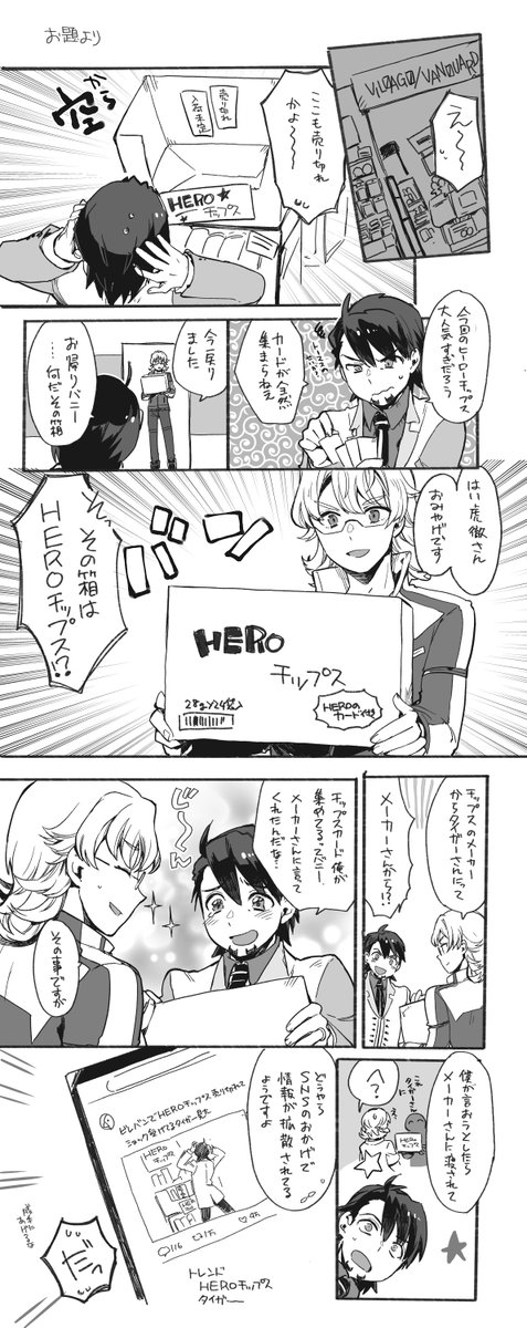 お題消化。ながくなっちゃった 読めなかったらごめん > ヒーローチップスのカードを頑張ってちまちま集めている虎徹さんとチップスのCM撮りを終えてお土産にヒーローチップスを段ボー… #odaibako_majibade1 odaibako.net/detail/request…