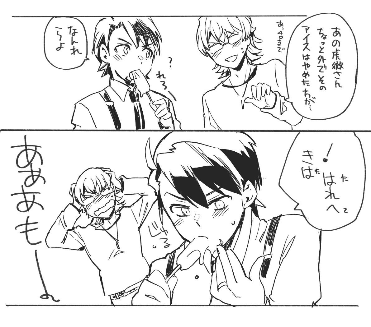 お題&と大好きありがとうです~!!喉を鳴らしてないと今気づいたすいません > アイスを食べてる虎徹さんを見て、喉を鳴らすバーナビーが見たいです!ゴルゴンさんの兎虎大好きです❤️ #odaibako_majibade1 odaibako.net/detail/request…