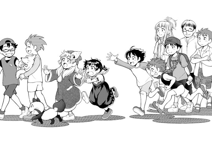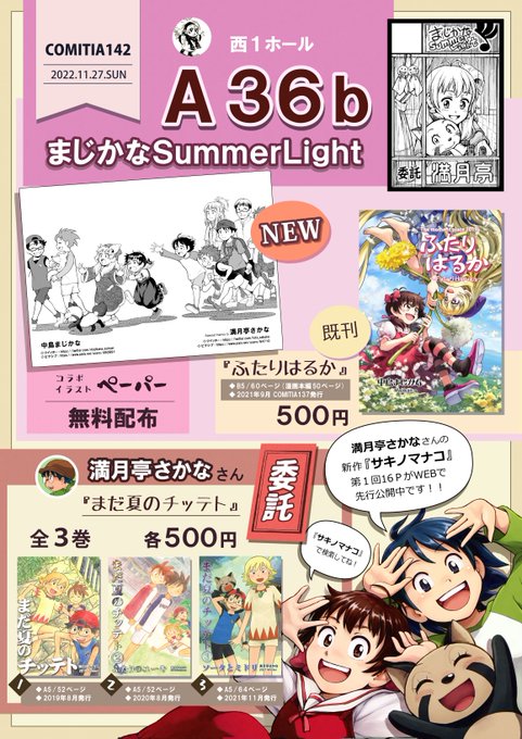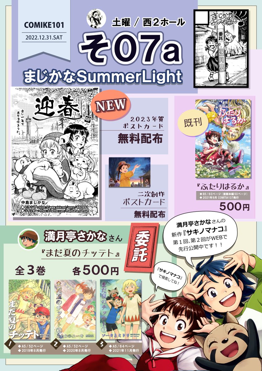 本日のコミティアに持って行くペーパーのイラストです。 コミティアに出品している私の漫画のキャラクターたち、委託販売させて頂いている満月亭さんの漫画のキャラクターたち、満月亭さんが執筆中の新しい漫画のキャラクターたち、私が描いている新しいネームのキャラクターたちを描きました!! twitter.com/majikana_sunsu…