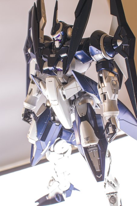 ハンブラビ君です。 肩パットが今にも千切れそうなので変形は後日撮れたら撮ります。 プロモーションは良好ですが、変形MSなのでブンドドするには可動がかなりきついので難しいかも👀 なんちゃって鏡面塗装したけど割ときっちり反射しててえらい #ガンプラ #ガンプラの画像貼るとRTされると聞いて