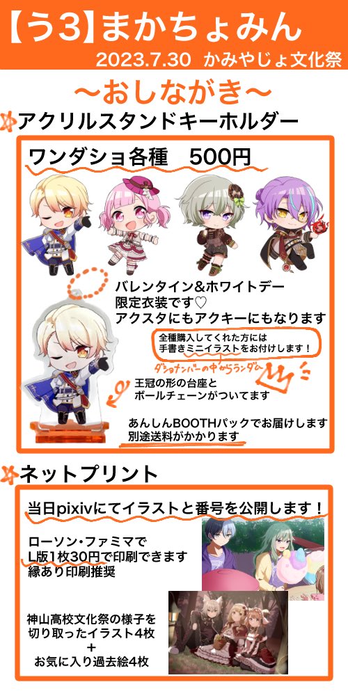 #かみやじょ文化祭 【う3】まかちょみんで出店します🎪 グッズの頒布とネプリをやります! 当日は書き込みボードでエアスケブも受け付けます!(イラストは後日投稿) 初めてのサークル参加で手こずることもあるかもしれませんが何卒よろしくお願いいたします🙌