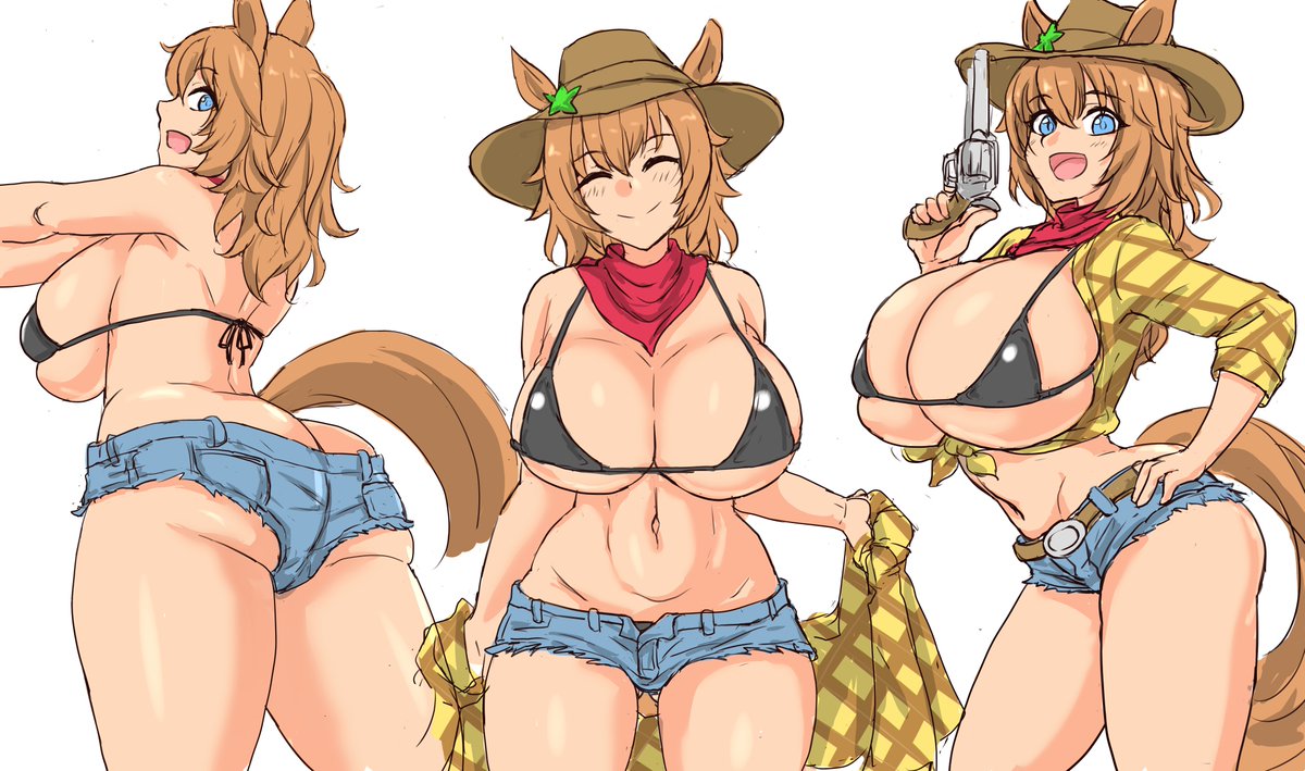 髪下したタイキシャトルで大質量を支えるために酷使される黒ビキニと尻肉が収まりきらない程ミチミチに詰まった極小ホットパンツが描きたかった