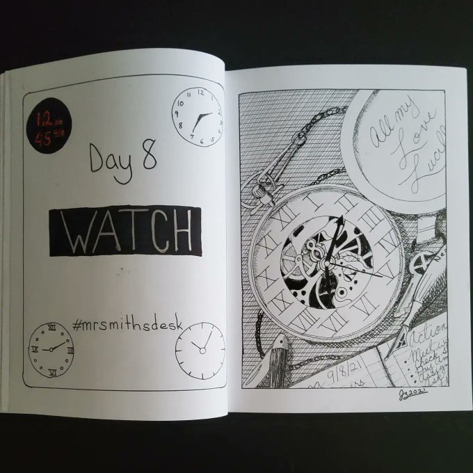#watch is the prompt for #day8 of #inktober so, a watch but also a little (very little) bit of an Easter egg so if you know who's desk this is, put your answer below. #inktober2021 #inktober2021day8 #inktober2021watch #art #penandink #pen #ink