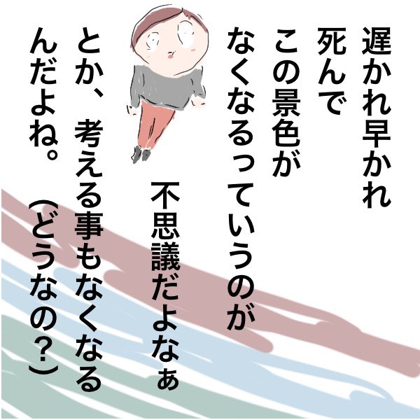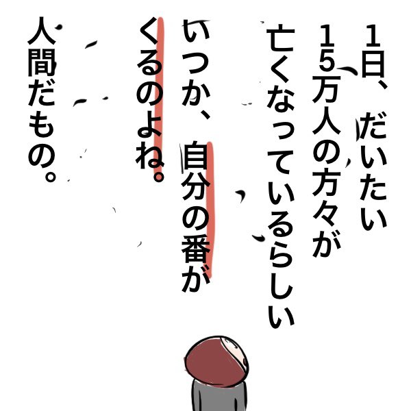 1 1 「死への準備は、ほんっと〜のところ、何をしたらいいんだろう?」 #イラスト #諸行無常 #死への準備 PS:死ぬまで一生懸命生きたらいいのか?って思うけど、「何に一生懸命生きたらいいんだろう?」何かあるのか、もしくは、ないのか、、、 23/02/22 19:39