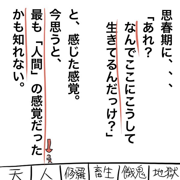 2 2 思春期の頃「なんでここに、生きてるんだろう?」という不思議な感覚を味わった。 #イラスト #諸行無常 #人間界 #六道輪廻 #解脱 人人間界でしか感じれない解脱の動機になるような感覚だったのでは?と、今思う。もしかして、めちゃくちゃ重要な感覚なんじゃ〜ないの?(違う?) 23/03/04 20:12
