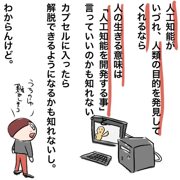 1 2 「人工知能が解脱システムを作ってくれるのか?(キボンヌ」 #イラスト #諸行無常 #人工知能 PS:違う、気がしてしまうけど。 猿では、解脱できないとも思うと。 人の次の方が解脱しやすいかも、とか? 23/03/09 19:34