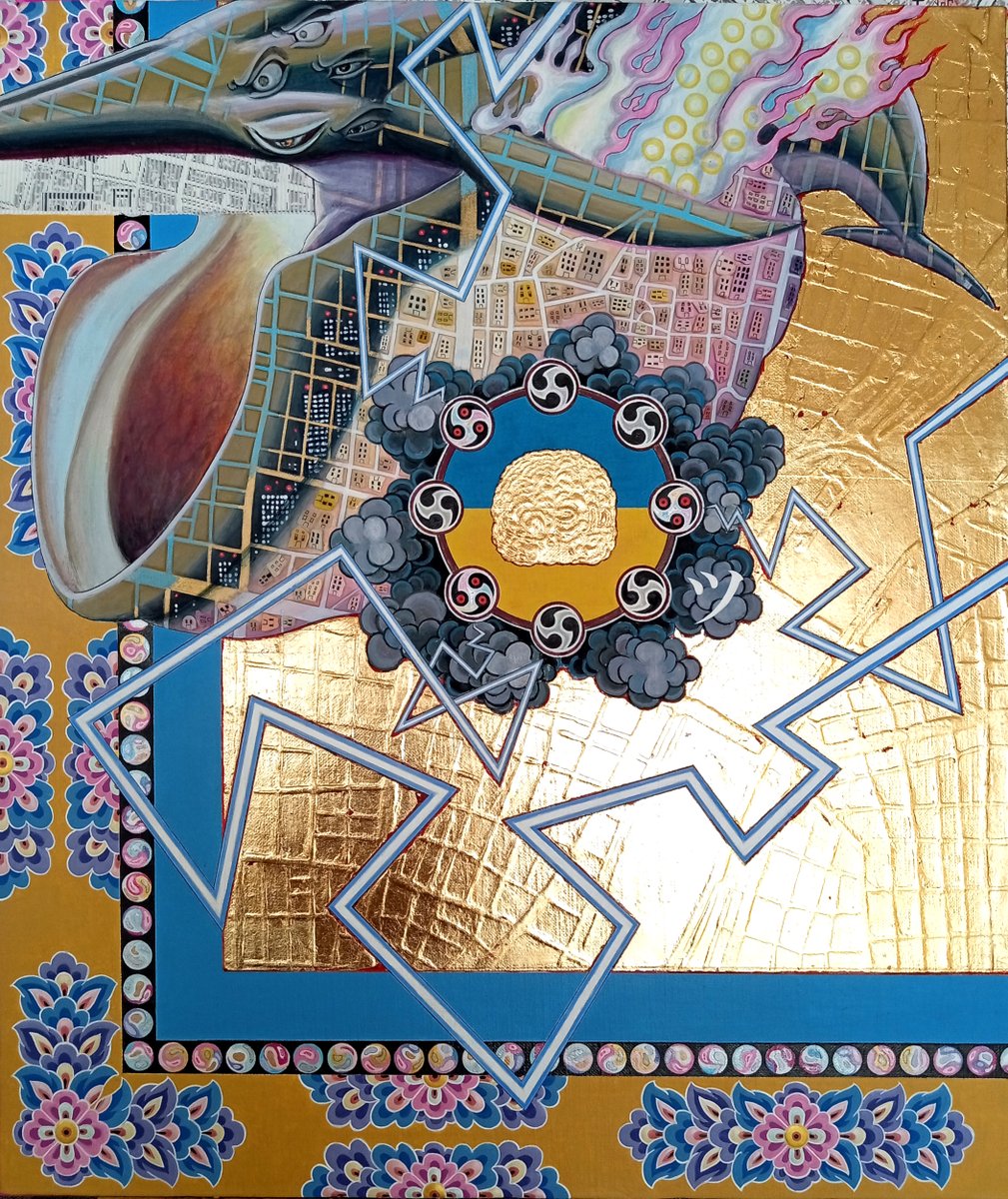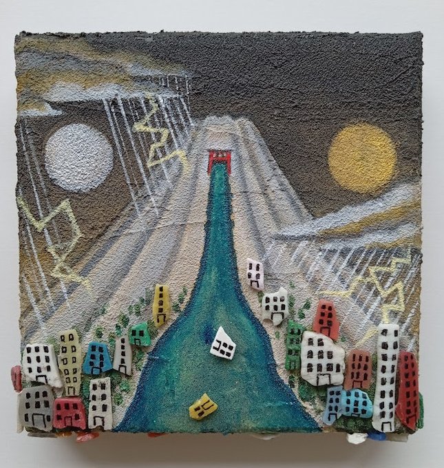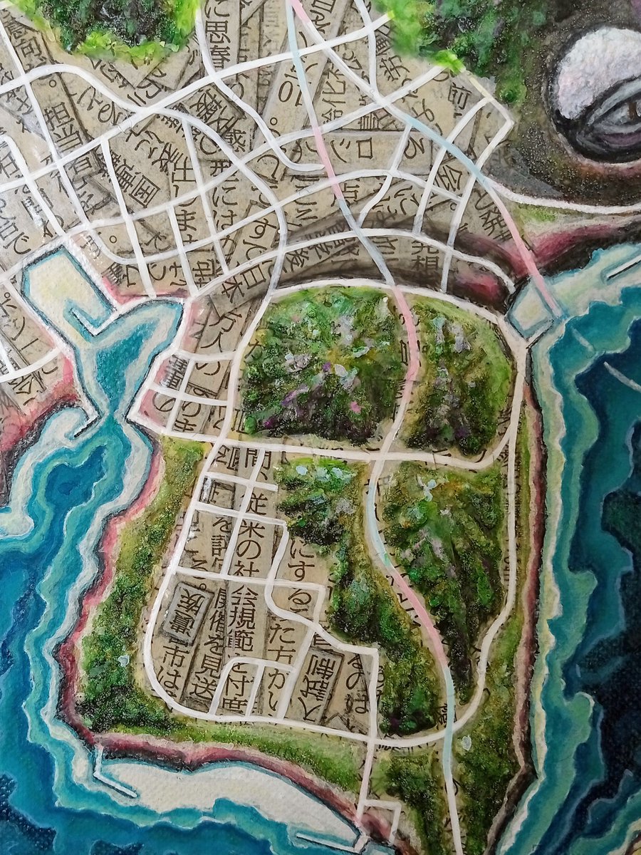 Any Kobe 展示作品 「TOKYO MONSTER_GoTo極楽8」 アクリル絵具、東京の地図、真鍮箔、海岸のプラスチック片、ペン、カンバス 72.7×60.6cm (F20) 2022 現代を生きる苦悩と未来への希望を表現 #anykobe #anykobewitharts2022 #海洋プラスチック #marineplastic #contemporaryart #現代アート