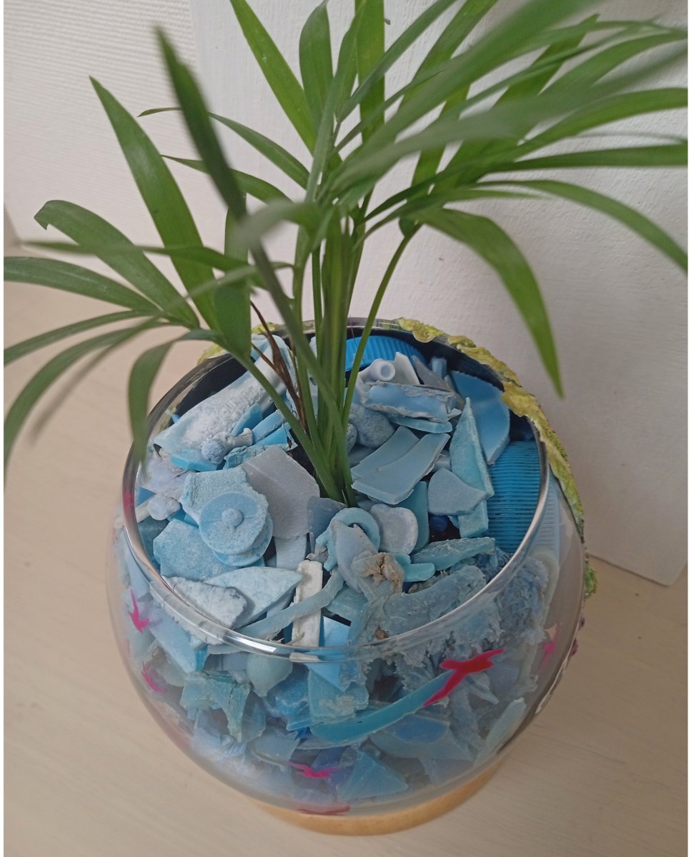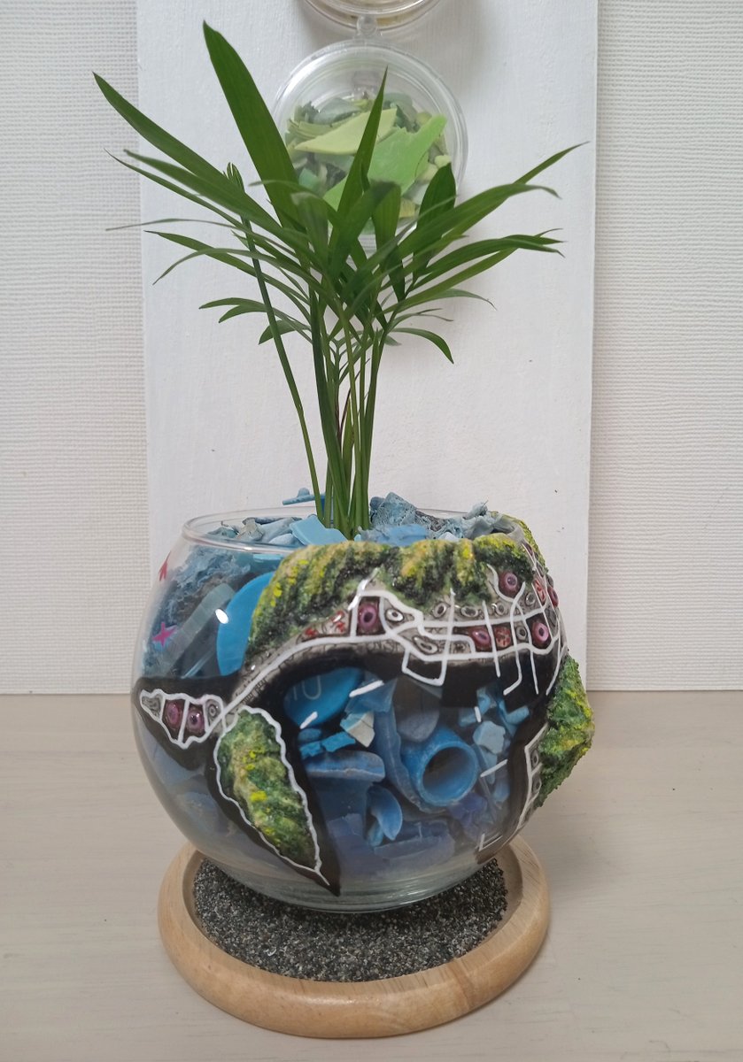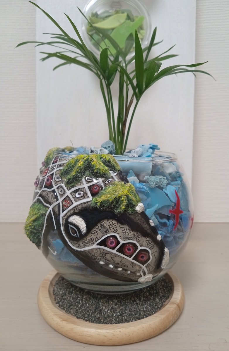 「New Colors」 Mixedmedia 2022 テラリウムを引用した作品。 プラスチックが溜まりゆく海について。 #現代アート #海洋プラスチック #テラリウム #contemporaryart #marineplastic