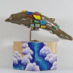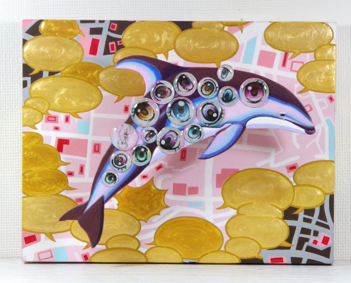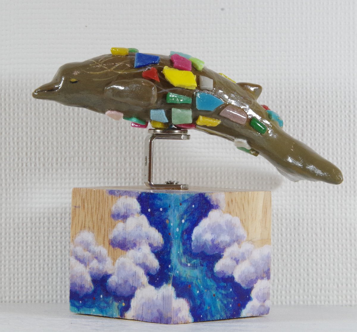 SMALL WORLD_1 (ハンドウイルカ) 石粉粘土、アクリル絵具、海岸のプラスチック片、磁石、金具、木材の端材 100×80×33mm 2022 陸(木材).海(イルカ)、空の要素で小宇宙を表現しました。 #windfallgallery #棚ぼた展 #イルカ #donphin #現代アート #海洋プラスチック #marineplastic