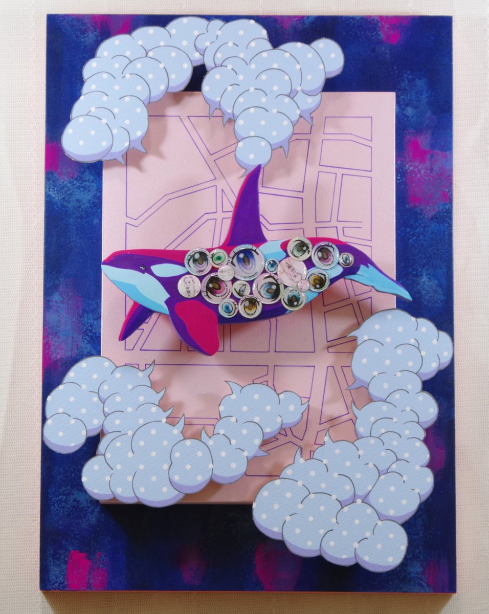 SMALL WORLD_2 (マッコウクジラ) 石粉粘土、アクリル絵具、海岸のプラスチック片、磁石、金具、木材の端材 125×125×25mm 2022 陸(木材).海(くじら)、空の要素で小宇宙を表現しました。 #windfallgallery #棚ぼた展 #現代アート #contemporaryart #海洋プラスチック #marineplastic