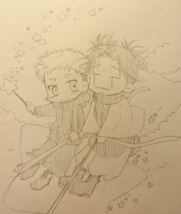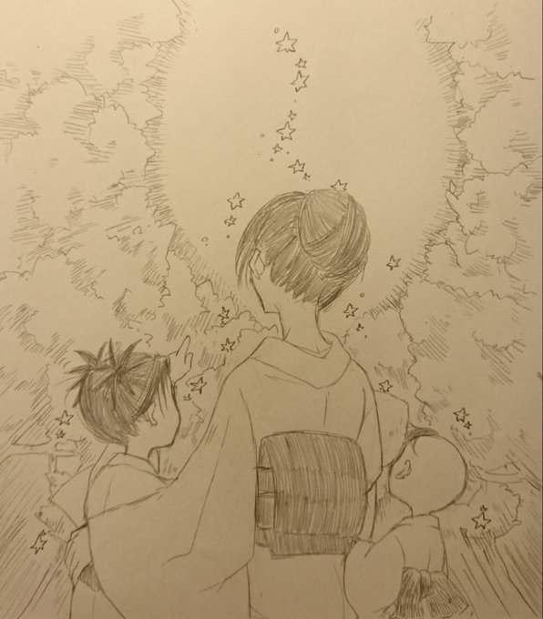 #繋がらなくていいから俺の九相図兄弟を見てくれ 星空を見てる兄弟とお母さん お母さんしゃがんでるって分からなくなっちゃったけど、お母さんも1度描いてみたかったから満足꙳★*゚