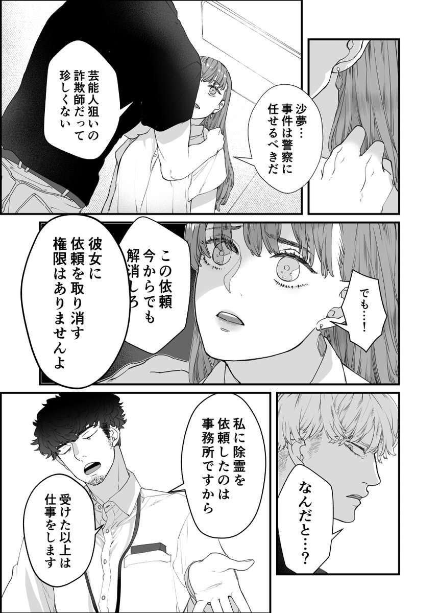 #オカルト漫画 #漫画が読めるハッシュタグ 「7話【盗撮者】前半」(4/6) 芸能人からの除霊依頼に色めくいちるくんだが、槙事務所には依頼受注のルールがあるらしい。 美人女優に頑固すぎる兄、チャラいマネージャー・・・てんやわんやの7話!【前後半全部読むならFANBOX】hal6666.fanbox.cc