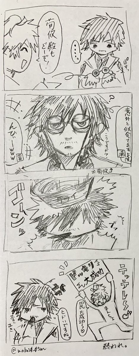 2 9 数分前の落書きから「クレイジーアイズを使った罠ってなんだろう…」って考えたけど、メガネのヒモ引っ張ったらタライが落ちてくるっていうドリフみたいなトラップしか思いつかなかった… そして犠牲になる荀攸殿… 21/12/05 02:55