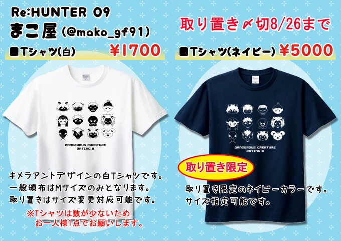 #ハンターオンリー2023 【まこ屋】 少し早いですが今年の頒布物のお品書きです。 ○取り置き受け付けます。 ご希望の方はDMにてご連絡お願いします。 ※受付締切は8/26までです。 ○Tシャツ(ネイビー)は取り置き限定での頒布となります。またTシャツを取り置き希望の場合はサイズ変更可能です。