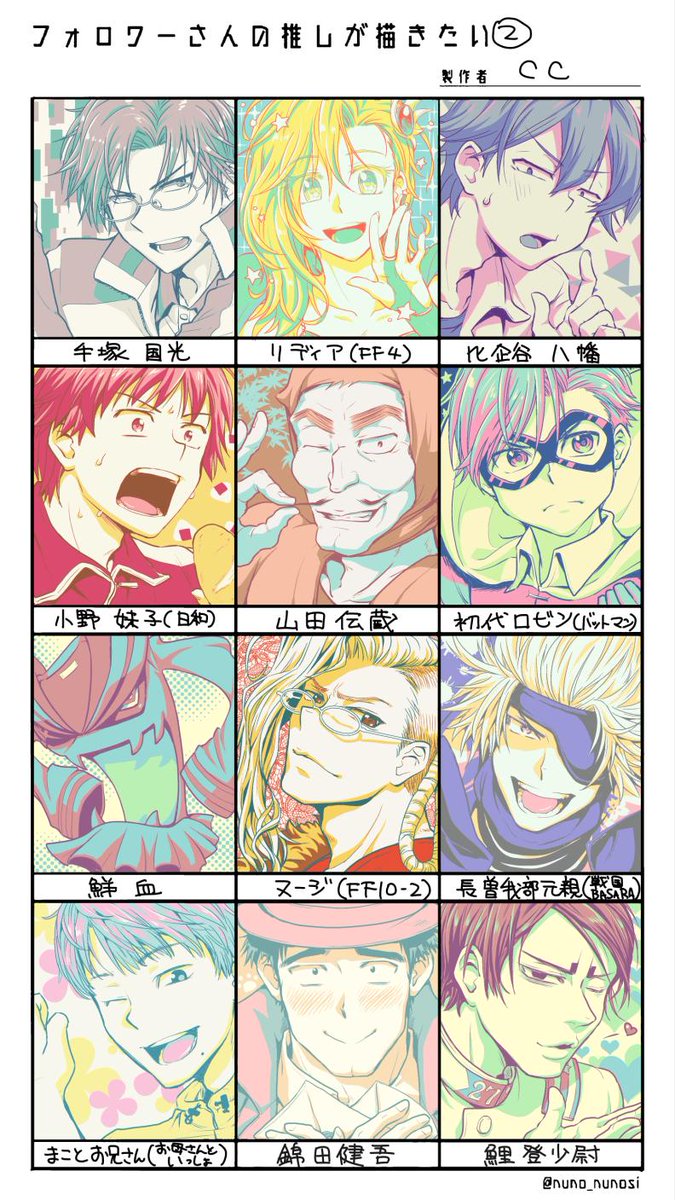 #フォロワーさんの推しが描きたい 2弾できました〜!コレ線めちゃくちゃ細く描いてしまったので見えるかな〜😭 普段描かない雰囲気のキャラばかりでめっちゃ楽しかったです!!リクくださった方々お構いくださってありがとうございました〜優しみ…!😂😂😂 リプ不要ですよ〜!😉✌️