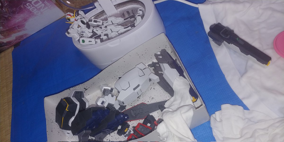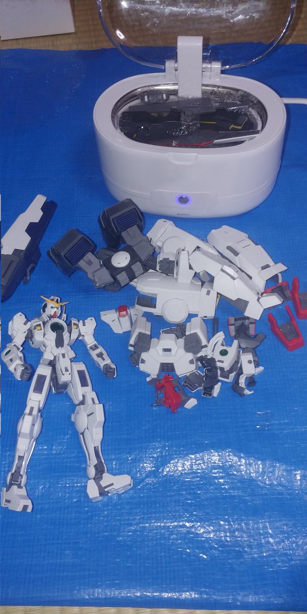 ヴァーチェの外装が大きいので洗浄機にかけるだけなのに1時間かかりました。 27日に購入して3週間が過ぎました。(まだ1週間前後かかります。) 予定では3日で完成だったのにw では家に帰還します。 #ガンプラの画像貼るとRTされると聞いて #ガンプラはどんな自由な発想で作ってもいいんだ