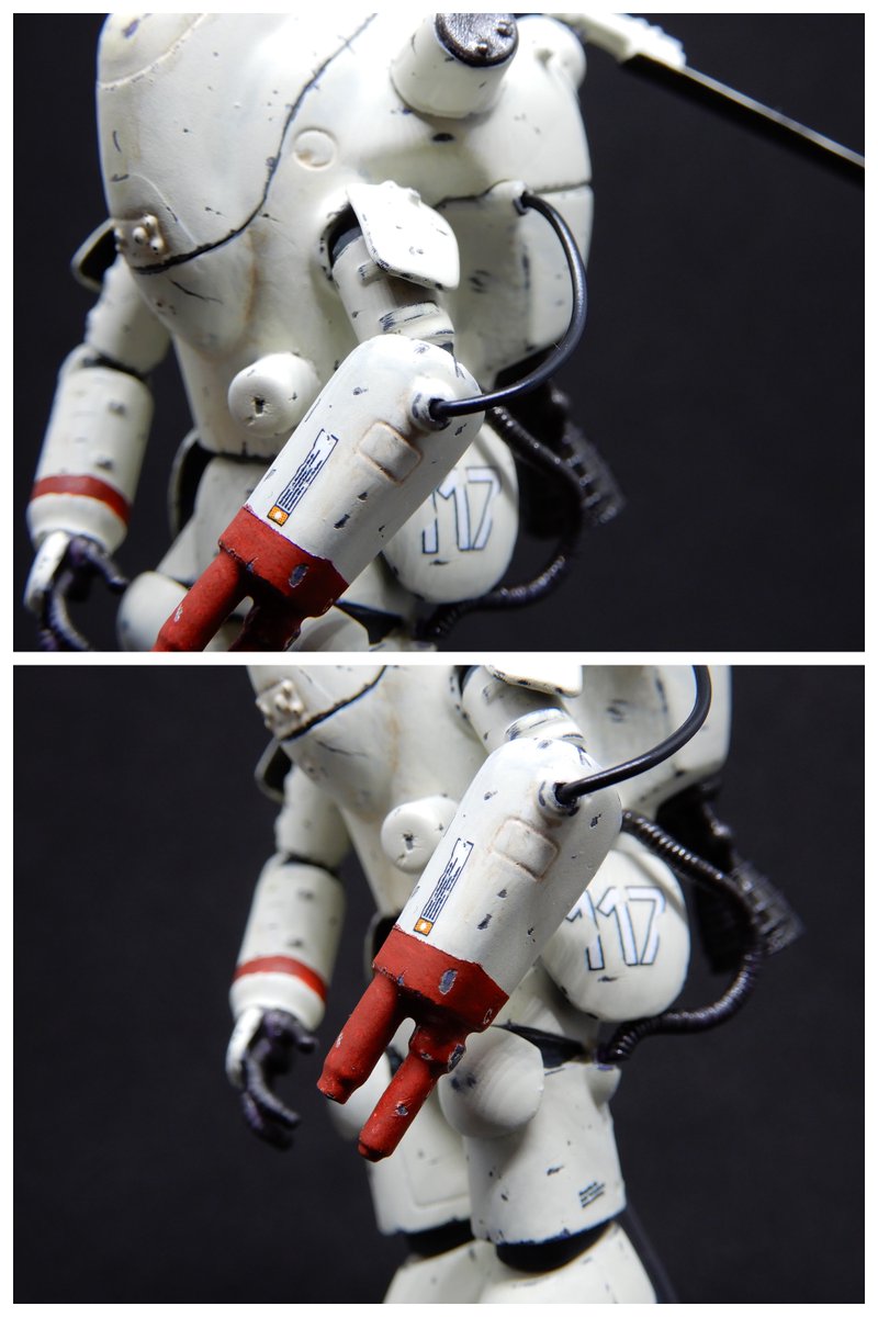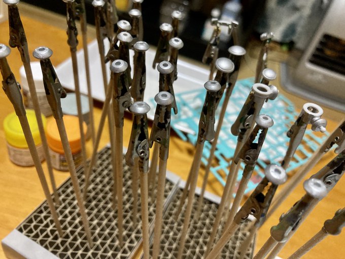 ケーブル入手したので 穴開けて準備だけしといた ラクーンに増設完了。 やっぱり雰囲気が出ていいね。 そこだけキレイなのは気になるけど。 ちなみに同時増設したアンテナは 真鍮線とかじゃなくて 伸ばしランナーに銀塗装したもの。 #マシーネンクリーガー #MaK