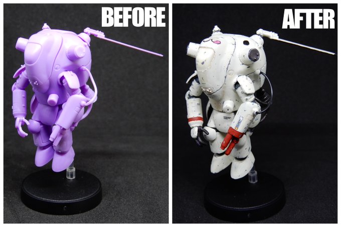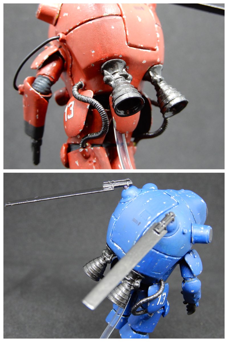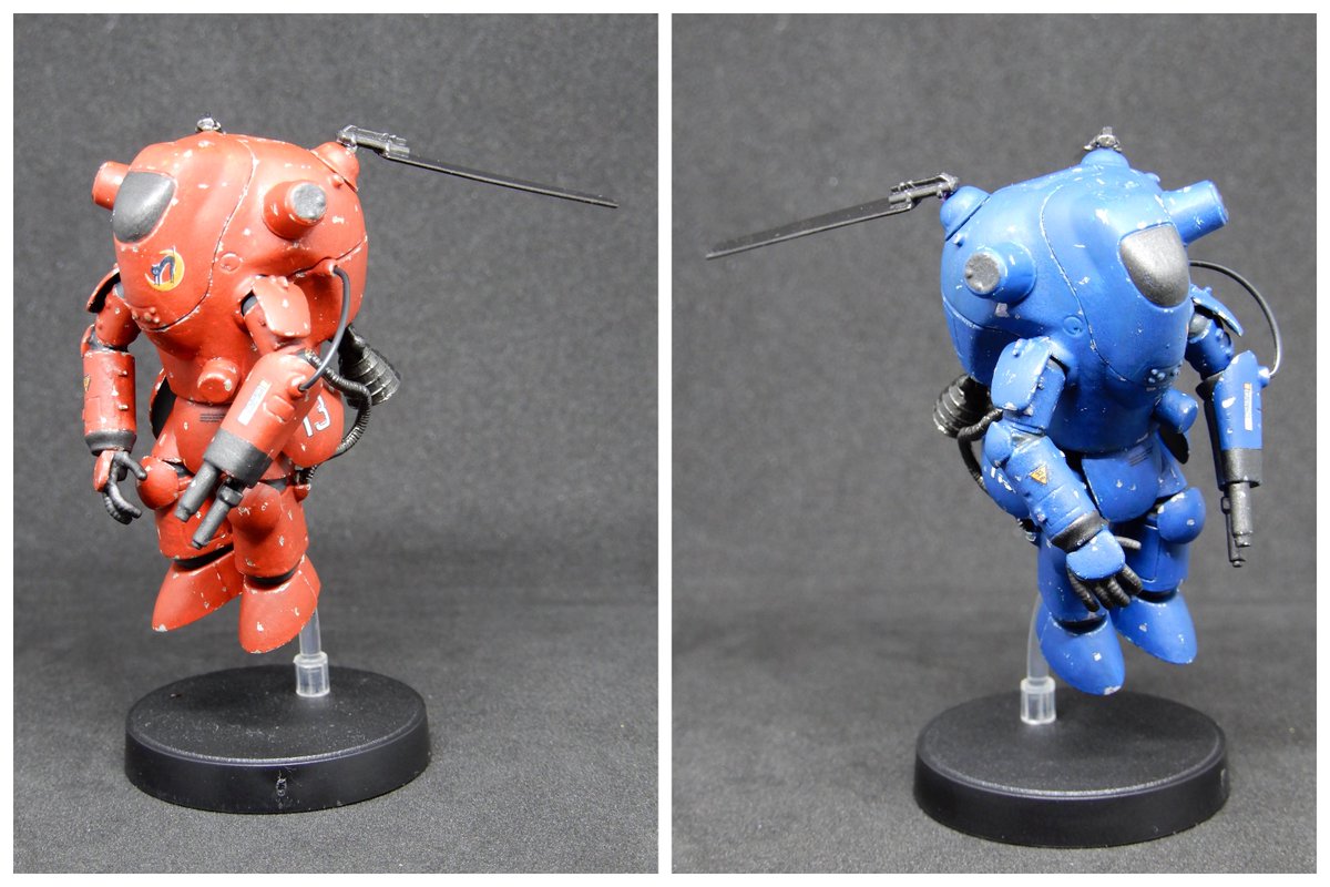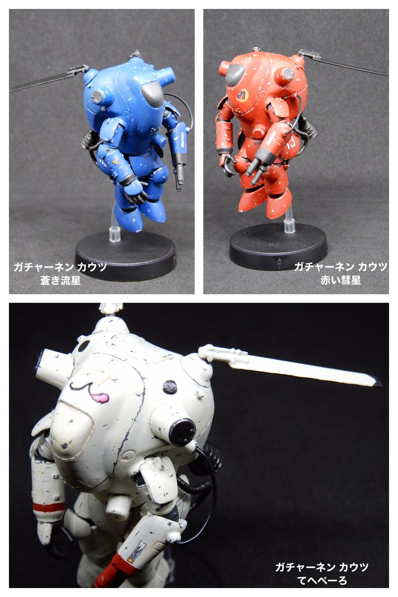 ガチャーネンカウツ、2体完成。 今回は今までマシーネンで あまり使ってこなかった 赤&青で塗装。 …マシーネンぽさが薄い気が。 青、撮影直前に落下して パーツいくつか折れた。 もう触れない。 ちなみにそれぞれの二つ名は 赤い彗星 蒼き流星 です。 #マシーネンクリーガー #ガチャーネン