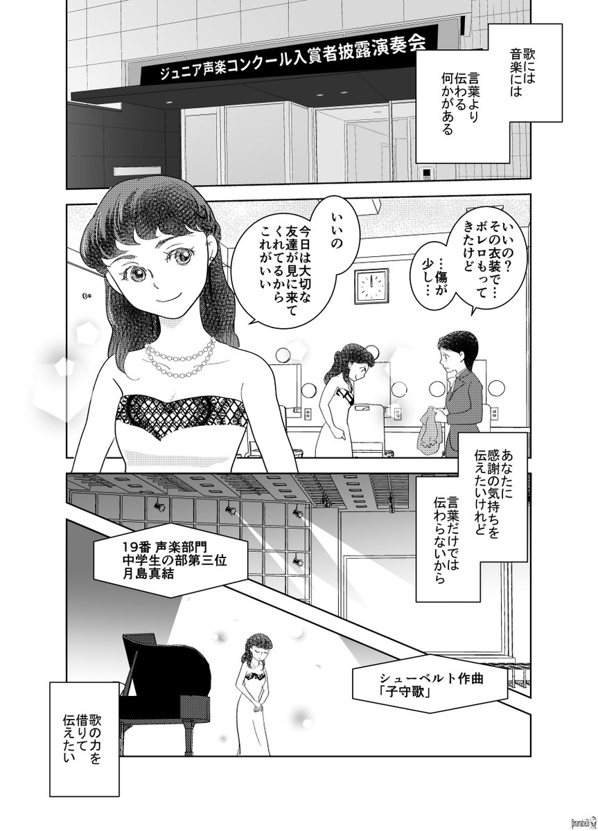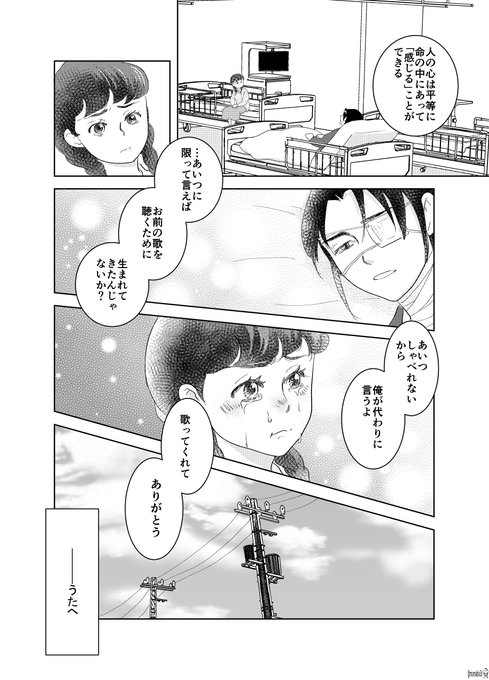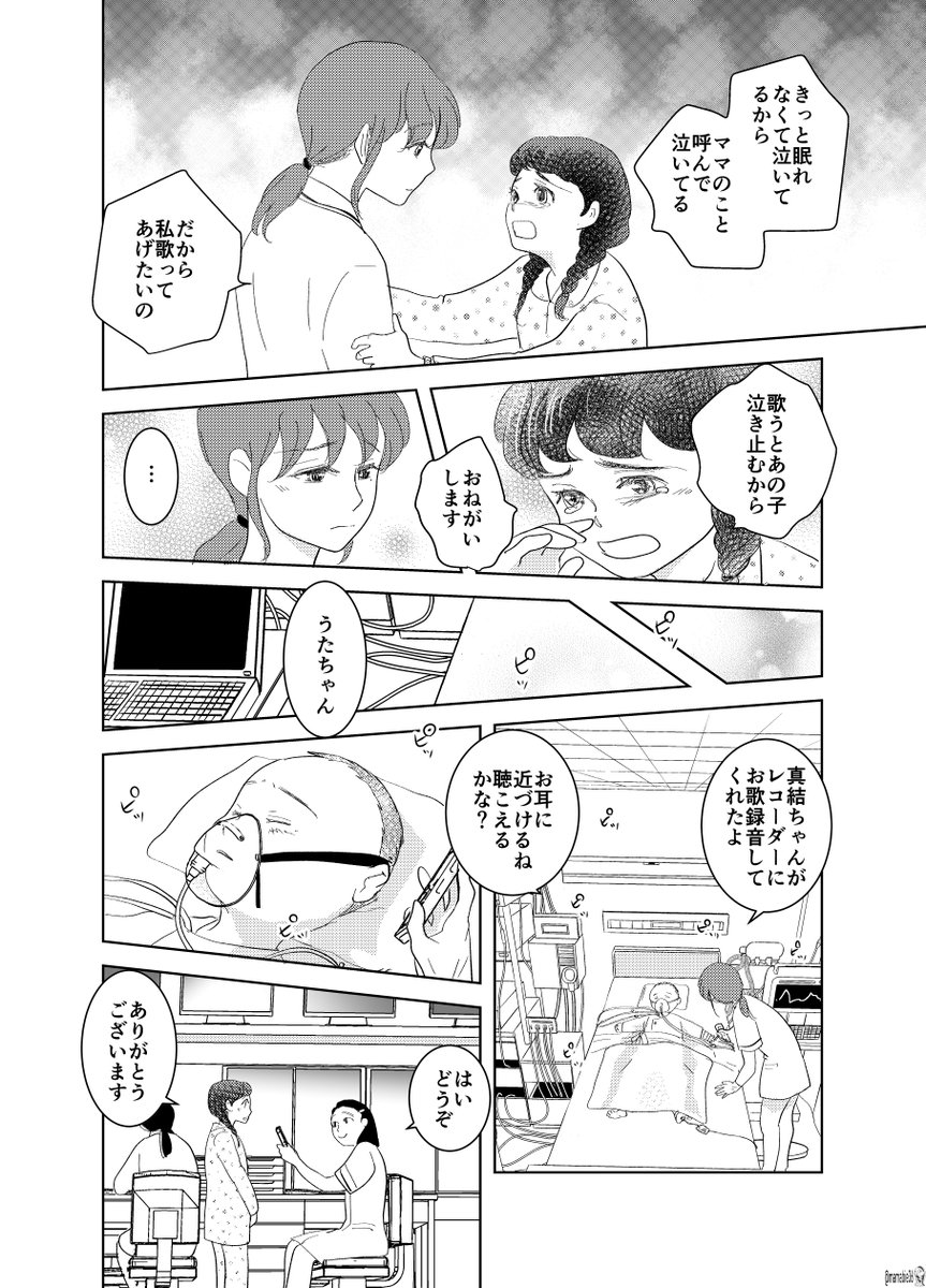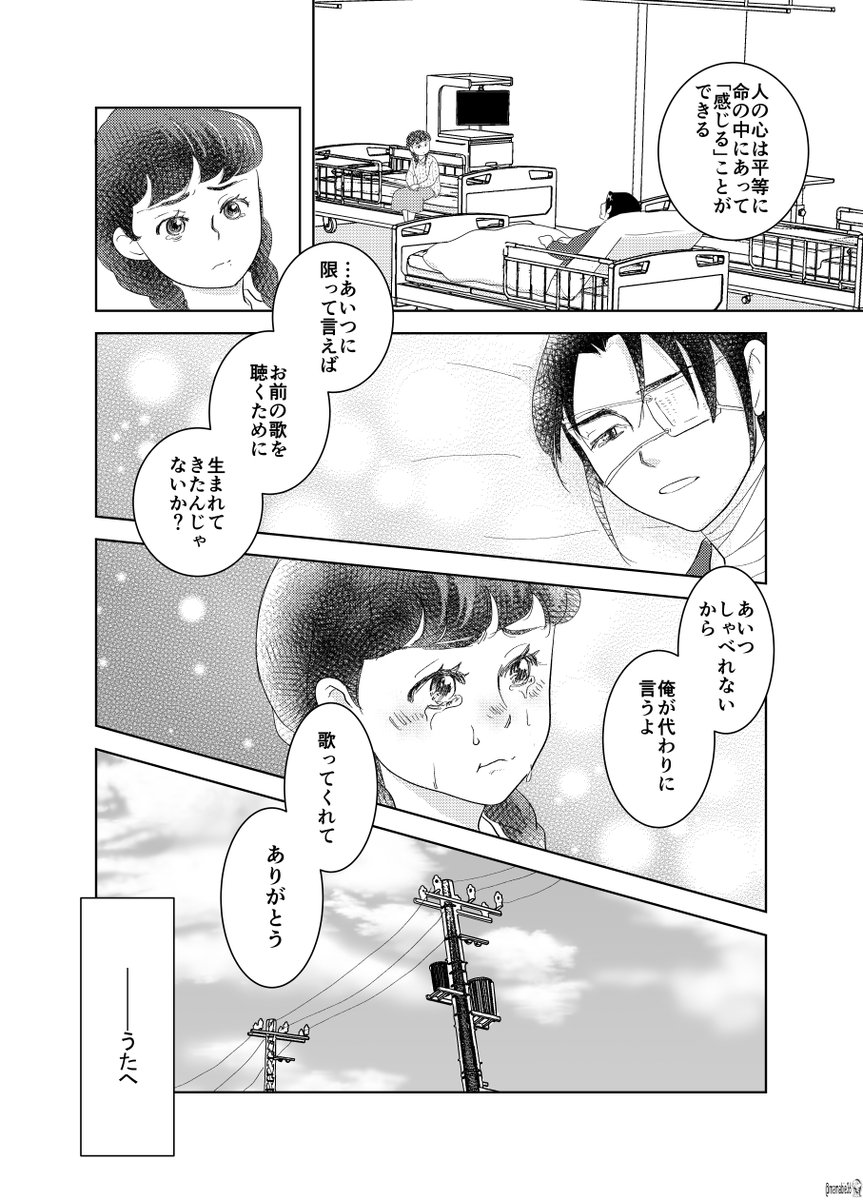 大好きな 山崎育三郎さんの歌 「君に伝えたいこと」に因んで 「ありがとうを伝えたい」 をテーマに10人分の人生を漫画で描きました。 10月は最後のお話しなので 大切な人と、歌への感謝を込めて…。 10人め「うた」1/⑥ #創作漫画 #漫画が読めるハッシュタグ