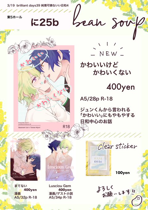 3/19ブリデ39 純情可憐ないい日和4 お品書きです。当日はどうぞよろしくお願いいたします☺️ お品書きとお願い pixiv.net/artworks/10611… ジュンひよ新刊サンプル pixiv.net/artworks/10611… 🐯予約ページ ec.toranoana.jp/joshi_r/ec/ite…
