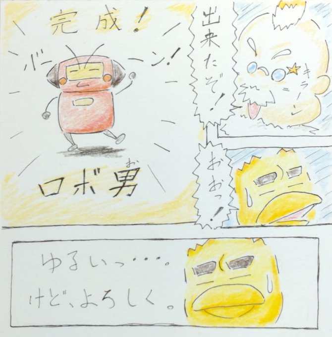 まめです。 博士ッペが短時間で完成させた、 ゆるいロボット、ロボ男です。 よろしくお願いします! 字が下手なのは勘弁して下さい(笑)。 #イラスト #落書き #イラスト好きさんと繋がりたい #落書き好きさんと繋がりたい