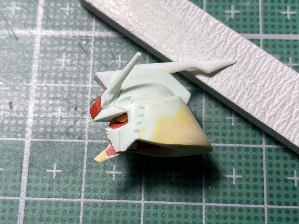 エントリーグレードガンダムの頭をポリパテとプラ板で改造。サザビー風に3本角に。乗る人はもちろん赤い人です。#ガンプラ #ガンプラの画像貼るとRTされると聞いて #ガンプラはどんな発想で作ってもいいんだ #ガンプラ好きと繋がりたい
