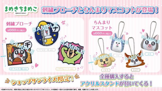 みんなやーー! 刺繍ブローチとちんまりマスコット (各種660yen)がでたよー!!🌼 ちんまりマスコットの肌触りが良…🍃 あと、ちびぬいの再販予約もしているみたいです!🌼🌼 購入はサンライズ公式ショップで↓ shopsunrisems.com/shopbrand/ct22…