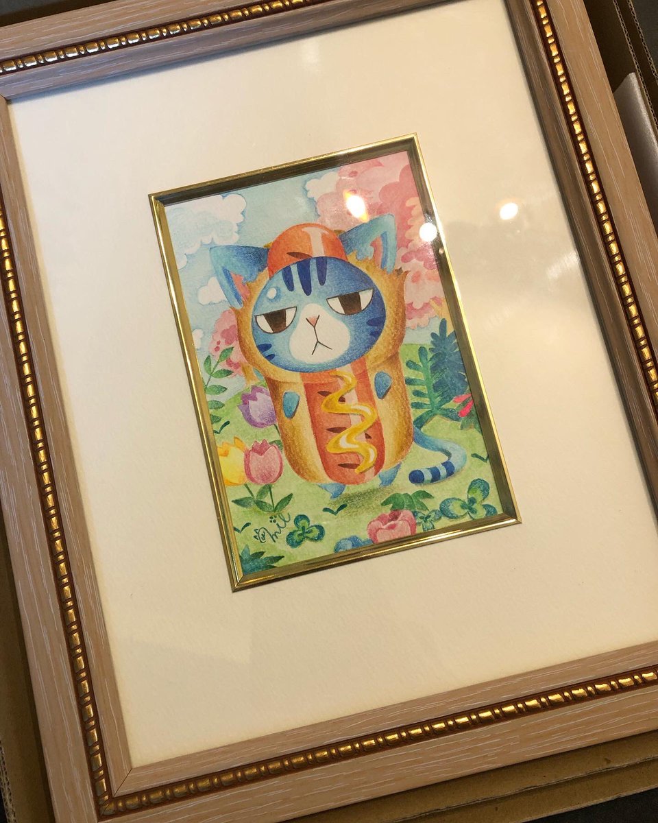 でけた #水彩 #色鉛筆 #ホットドック #猫イラスト