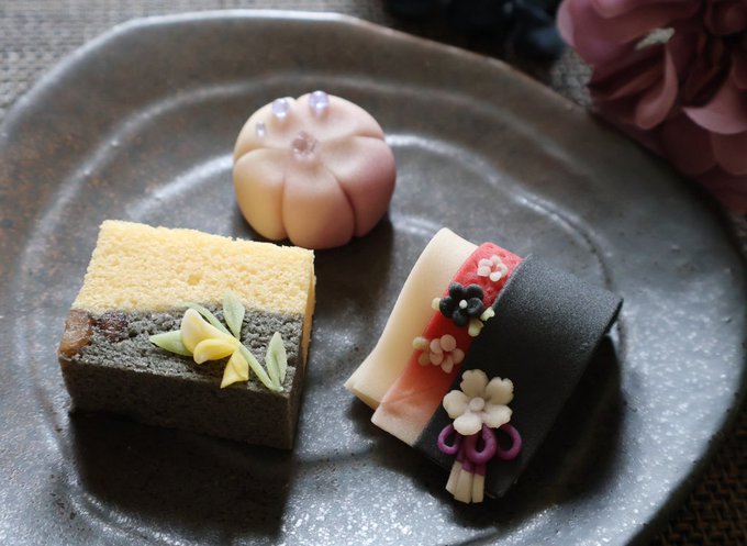 実休光忠の茶菓子🌿 練りきりと浮島、外郎で作りました☺️