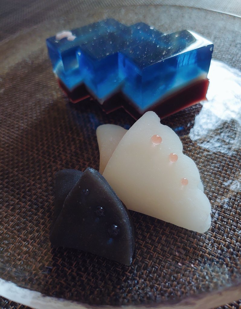 面影の練りきりと錦玉羹🦋 美しい羽根のような衣装と髪のグラデーションの雰囲気を詰め込んでみました☺️