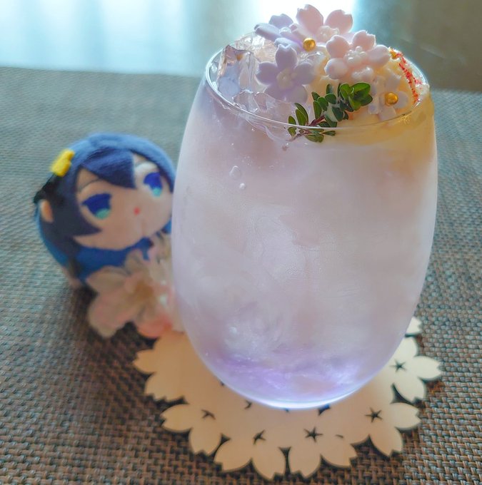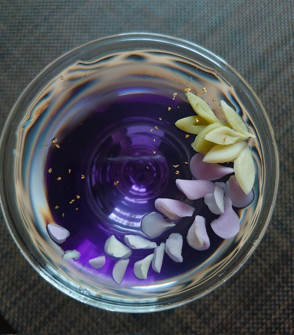 ゆうべの光景🥂 燭台切さんのチューハイで作ったゼリーです☺️ 梅の花と紋に描かれる笹も添えました🌿 (ブルーベリーは冷凍を使ってます🫐)