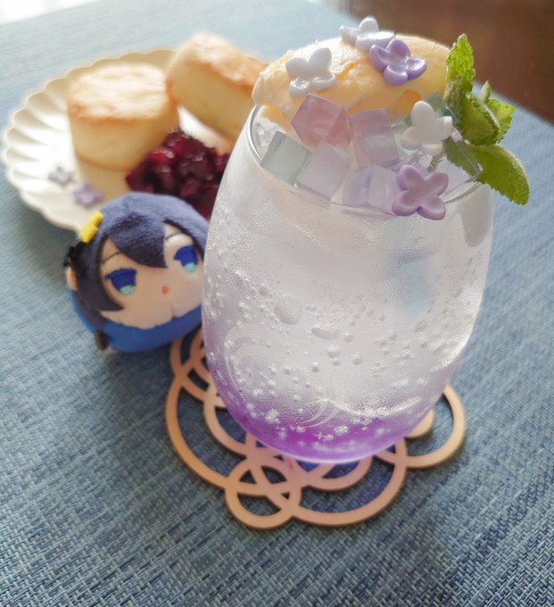 34 138 ゆうべの光景🥂 燭台切さんのチューハイで作ったゼリーです☺️ 梅の花と紋に描かれる笹も添えました🌿 (ブルーベリーは冷凍を使ってます🫐) 22/12/29 18:24