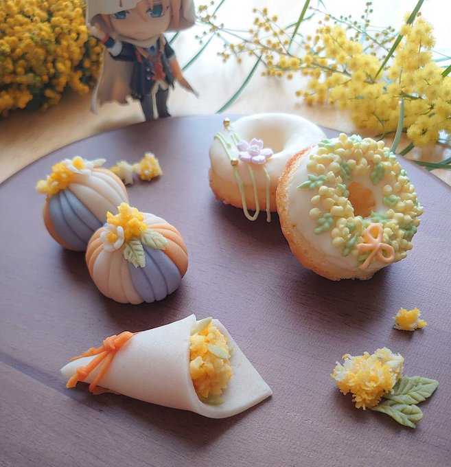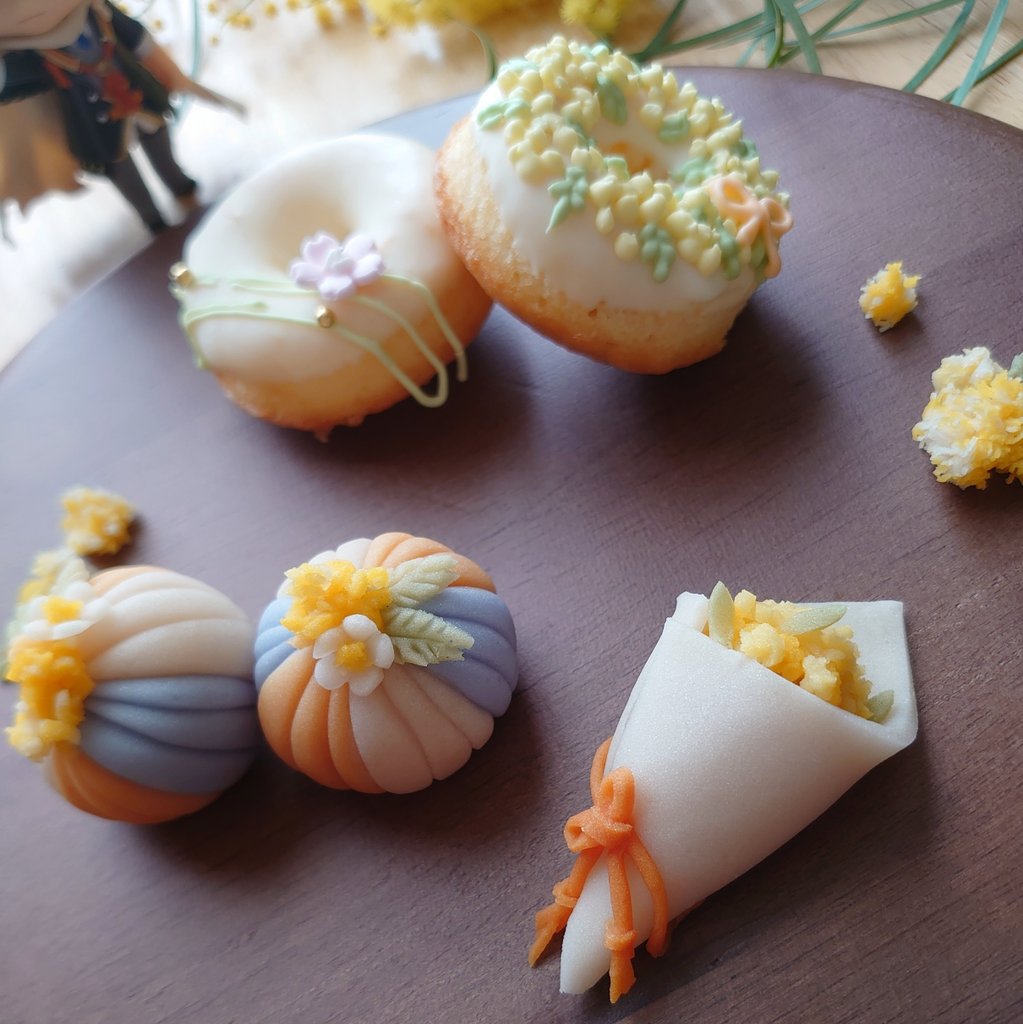ミモザの花束練りきりはリボンがまんばちゃんの紐になってます🎀☺️
