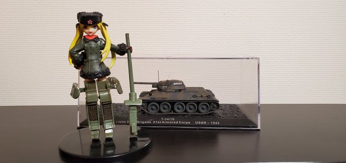 T-34-85の擬人化(?)フィギュアを見つけたので買いました〜 ウェザリングもされていましたw かわいいですΣd(・ω・*) (背景の戦車はT-34-76です。85はありませんでした(´・ω・`))