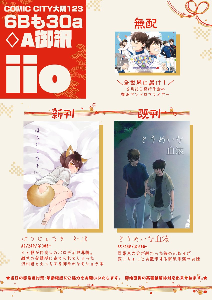 17 31 【1/8CC大阪123】お品書き【御沢】 pixiv.net/artworks/10430… お品書き、サンプルを上げました!当日は宜しくお願いいたします! 23/01/07 01:17