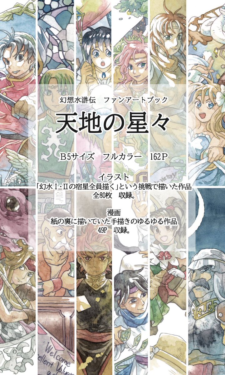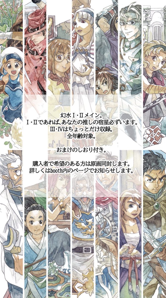 「幻想水滸伝」のファンアートを詰め込んだ同人誌📘刷ります。値段はおそらく1500~2000円くらいかと。希望の方には原画のプレゼントを考えてます。 リプに部数アンケありますのでご興味ある方、投票お願いいたします。