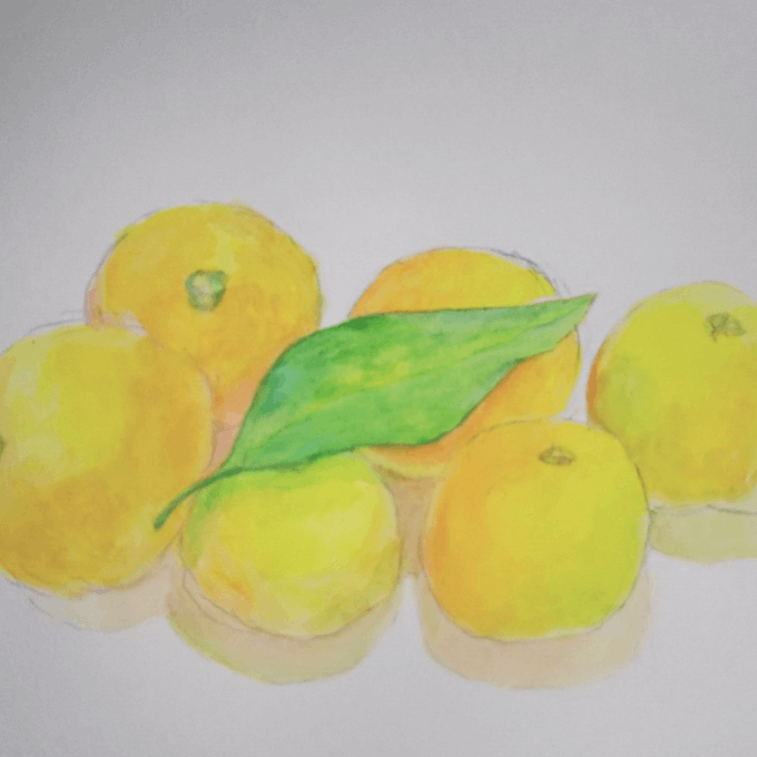 2 39 きょうは地場野菜売り場で買った小さな柚子✨ なぜか葉っぱが添えられていました。 (画用紙に水彩) #柚子 #葉っぱ #水彩画 #水彩 #絵描きさんとつながりたい 21/12/10 20:27