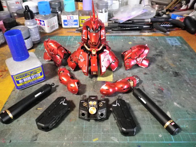 1 2 RG1/44 サザビー 製作中 出来てるとこからデカール貼り やっぱりマットブラックに金はかっこいいな #サザビー #ガンプラ 23/03/18 17:09