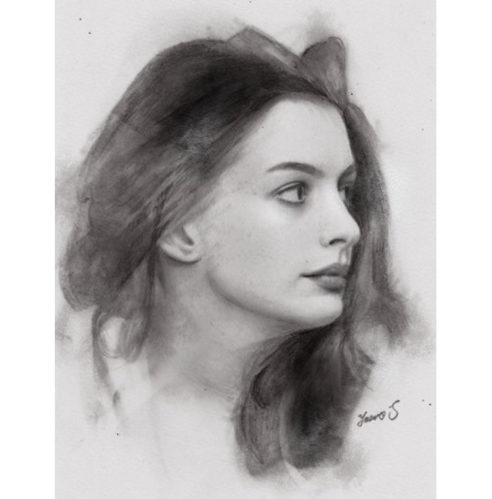 こんばんは、今日はアンハサウェイさん描いてみました、二枚目は2年前に描いた絵です、よくこんな絵、ポストしたなーって恥ずかしくなります。でも絵は自己満足のに世界、自分でいいなって思ったら他人の評価は気にならないですよねー😊 #鉛筆画 #リアル鉛筆画は誰でも描けます