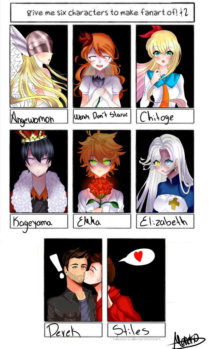six characters +2 why I want and why I can #sixfanarts #sterek #teenwolf #nisekoi #chitoge #nanatsunotaizai #elizabeth #thepromisedneverland #emma #haikyuu #wendydontstarve #FANART #digitalart #comissionsopen