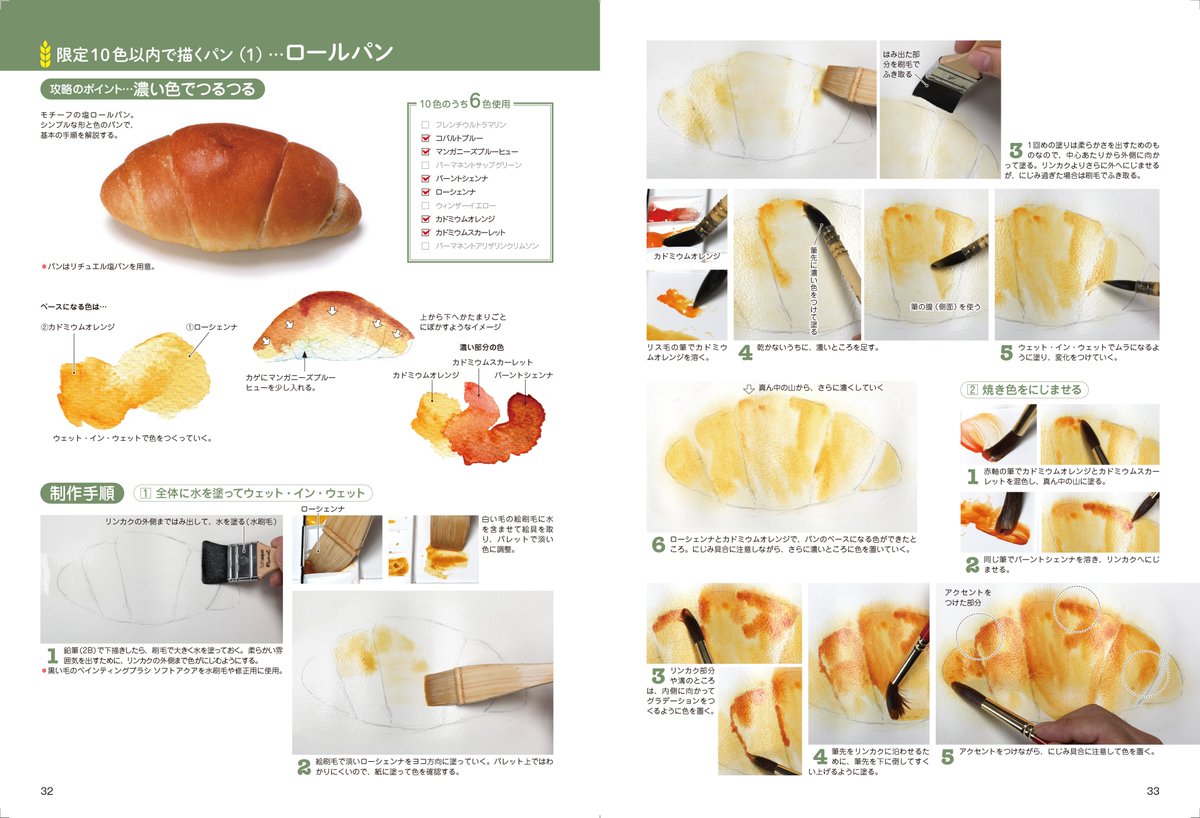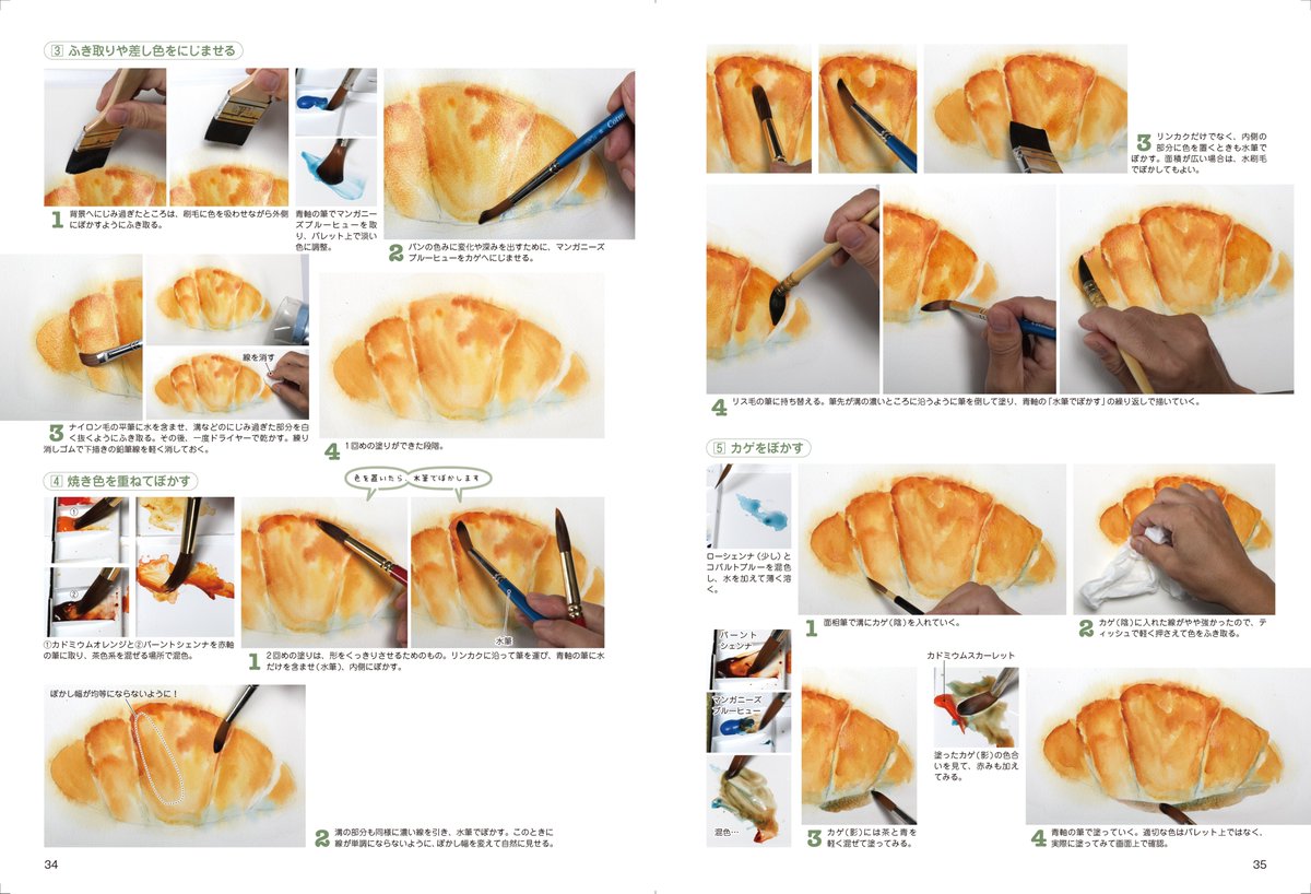 【12月3日発売】【透明水彩 おいしい卓上静物の描き方】 「卓上静物」とは食卓に並ぶ食器類などのこと。パンを通してテクニックを学び、ガラス、金属の表現を学んでいきます。 #水彩画 #パン twitter.com/manga_gihou/…