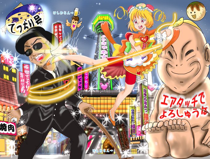 【大阪新世界で串カツのレシッピッピ奪還に闘うキュアヤムヤム】 #デリシャスパーティープリキュア #キュアヤムヤム #絵描きさんと繋がりたい #イラスト好きな人と繋がりたい #通天閣 #大阪 #新世界 #華満らん #串カツ #ビリケンさん